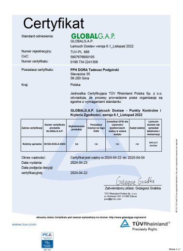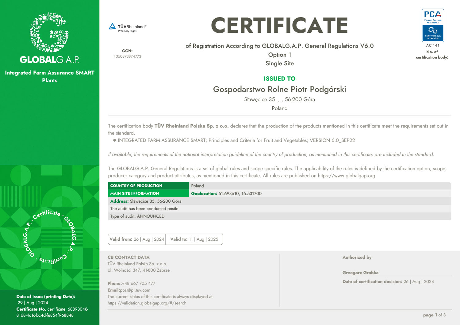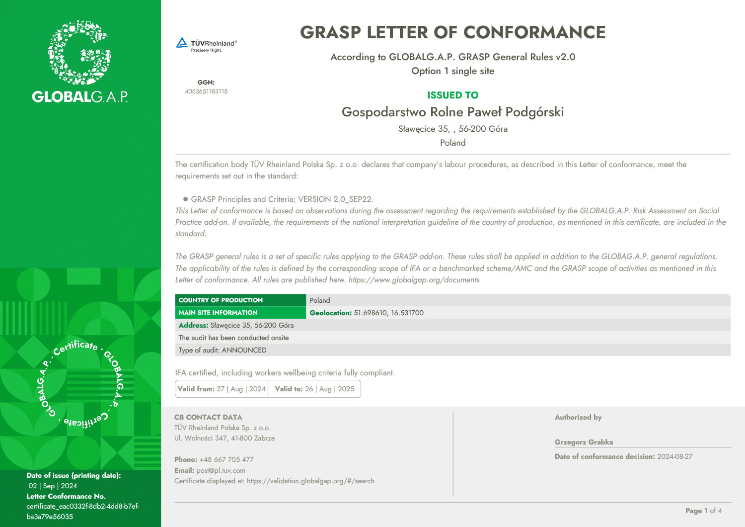 W trosce o bezpieczeństwo żywnościowe i spełnienie wymagań prawa oraz oczekiwań klientów wdrożyliśmy i rozwijamy system GlobalGAP oraz HACCP dla czynności po zbiorczych (blanszowanie, mrożenie, pakowanie, transport).